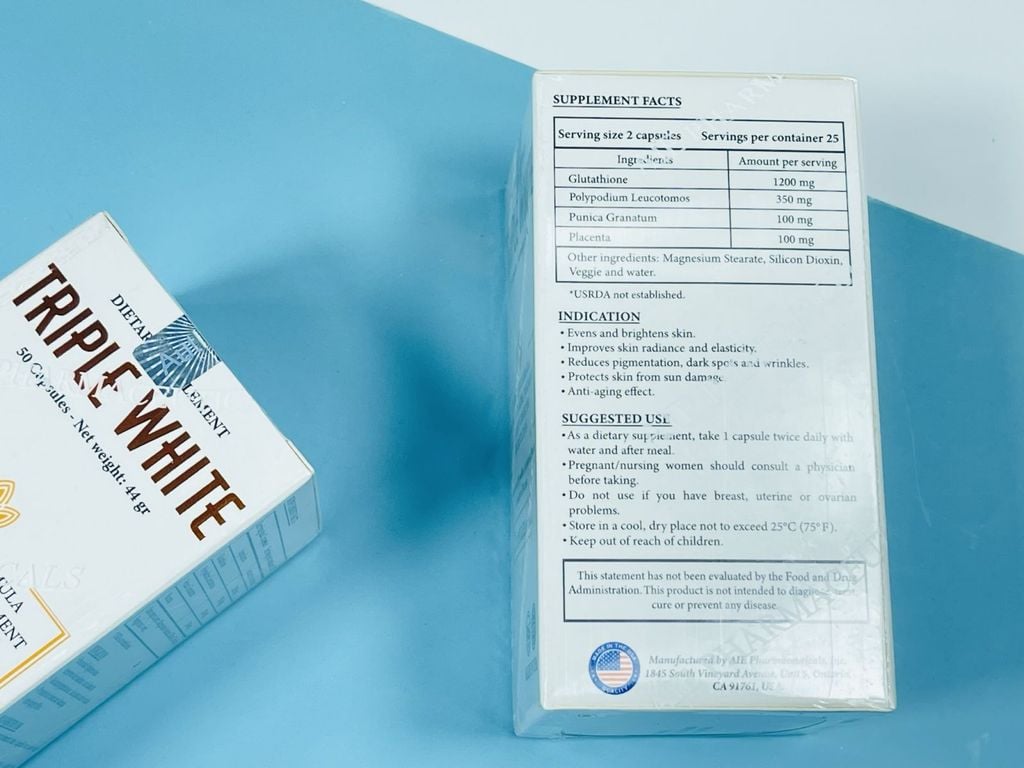 ✔️ Viên uống Triple White chống nắng trắng da trị nám Glutathione 1200 mg (Hàng Mỹ) có tác dụng trị thâm nám, dưỡng trắng và làm đều màu da.
